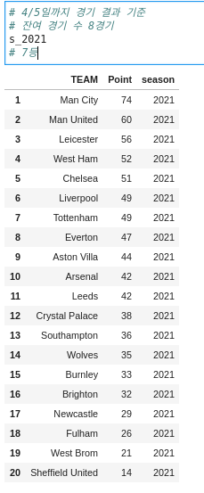 | [ Python Project ] EPL 데이터 분석을 통한 토트넘의 현실 - 2 (9) | 2021.04.16 |