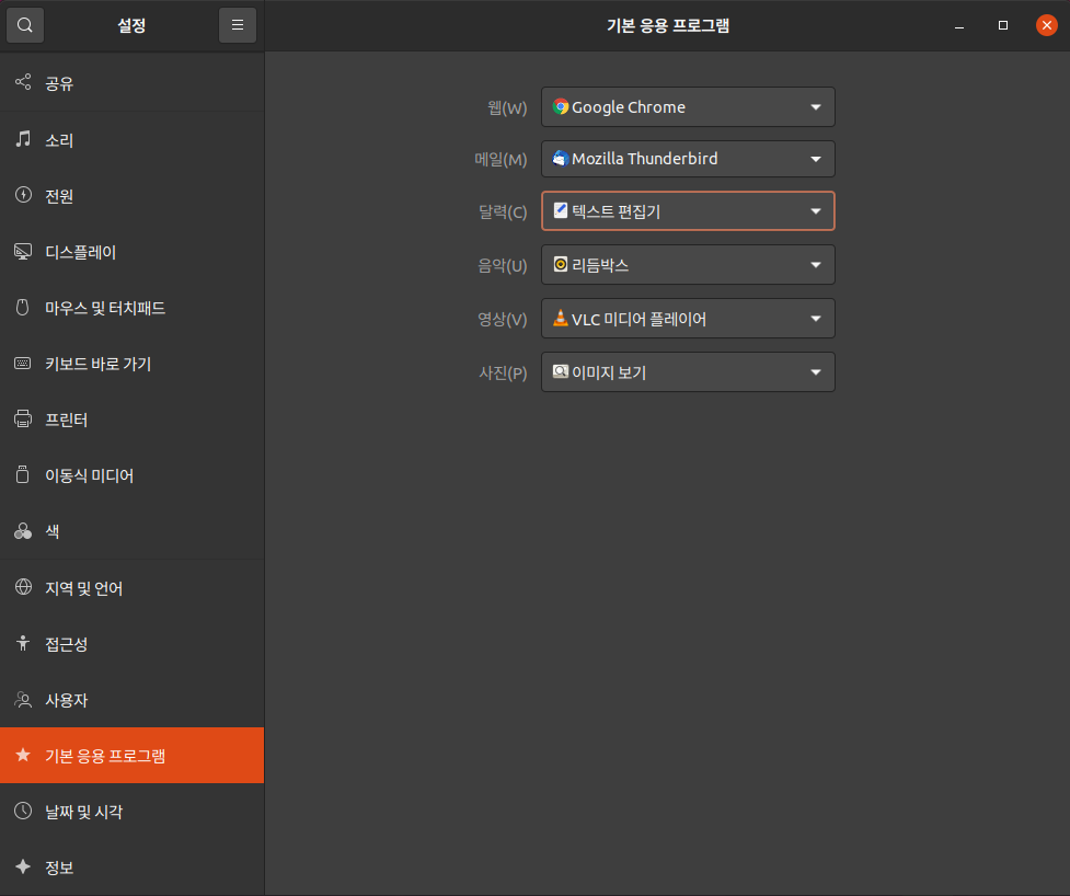 - 구글링을 했더니 대부분의 블로거들은 우분투 [설정] - [기본 응용프로그램]에서 변경하는 방법을 가르쳐 주었다.