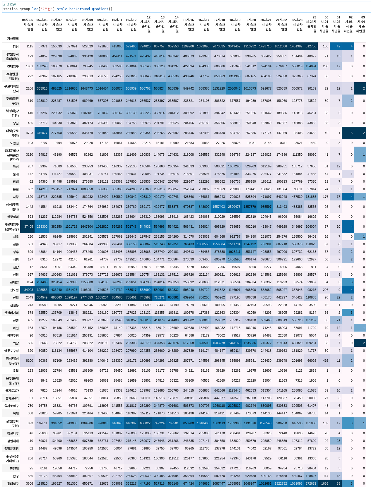 히트맵은 분포를 중심으로 보았기 때문에, 강남역 같은 경우 05시부터 23시까지 꾸준하게 많지만,
