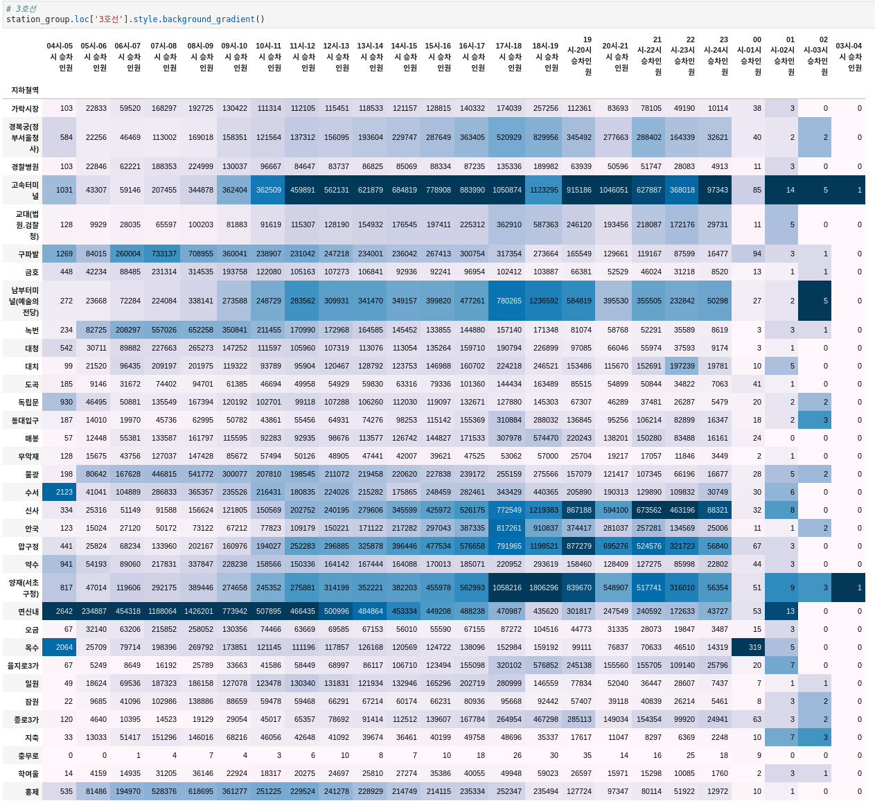 열마다 승차인원이 많은 곳은 색깔이 진하다.