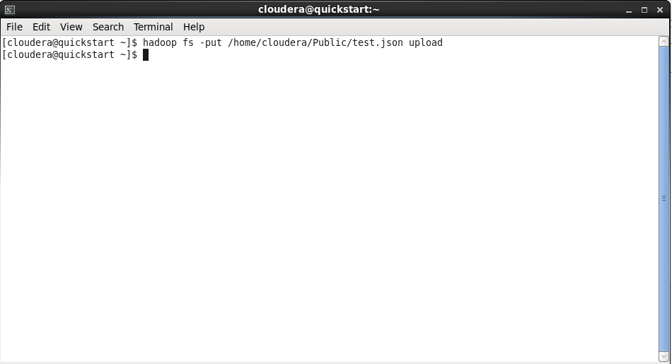 Cloudera 가 설치되어 있는 환경에 test.json 파일이 존재하고, Cloudera 환경에서 HDFS로 파일을 전송했다.