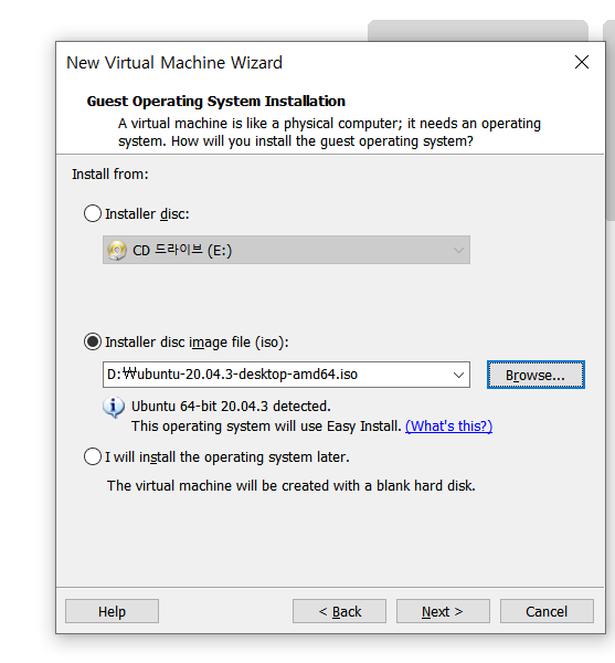 3. iso 파일로 다운을 받았기 때문에 설치한 경로에 있는 iso 파일을 넣어준다.